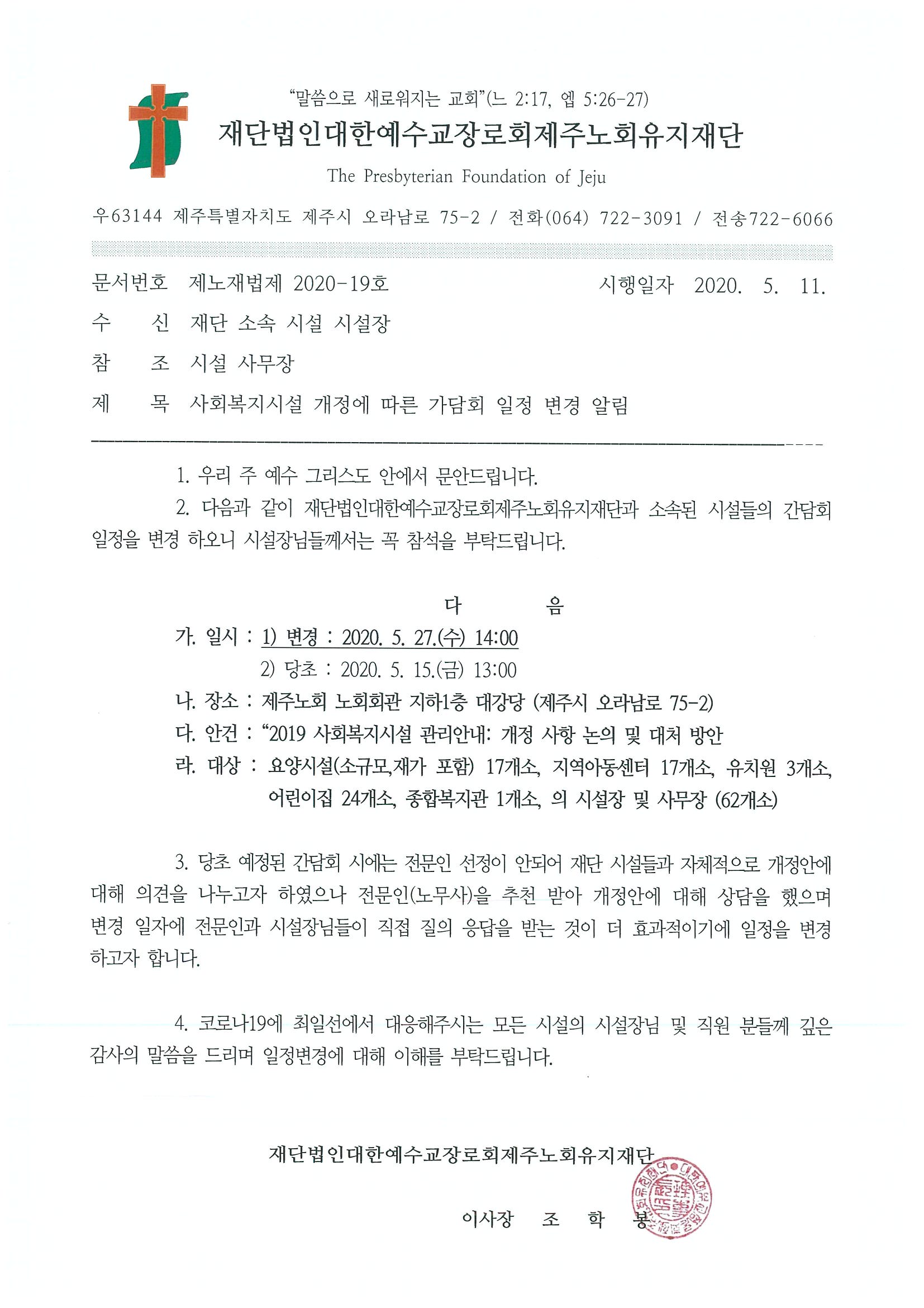 제노재법제 2020-19호 유지재단 산하시설 간담회 일정 변경 알림