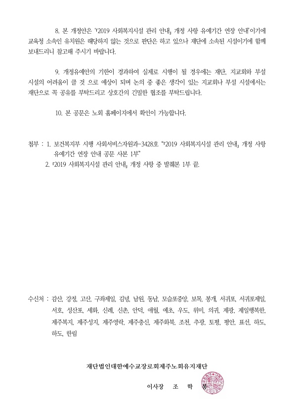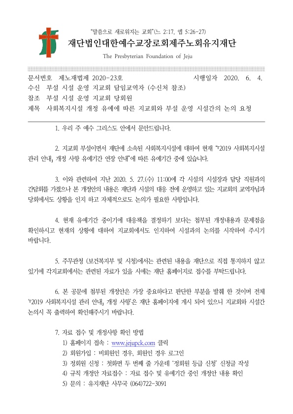 제노재법제 2020-23호 사회복지시설 개정에 따른 지교회와 부설운영시설간의 논의 요청