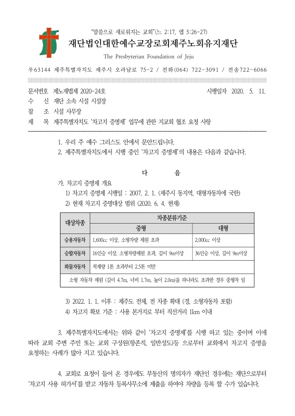 제주노회 발송 공문
