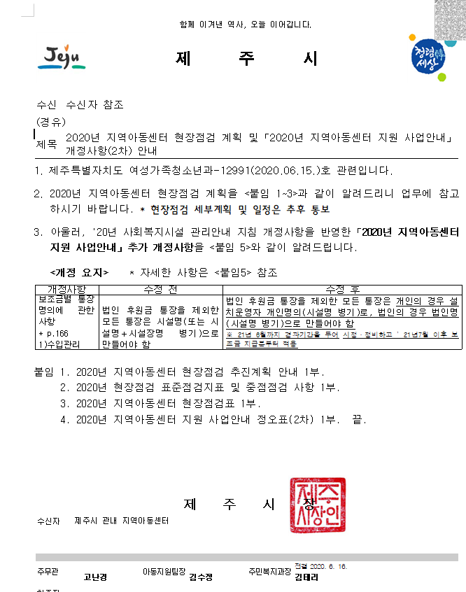 한노중 사회복지시설 고유번호증 변경 관련 공문