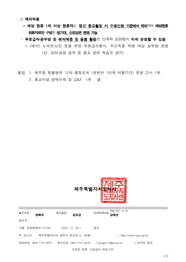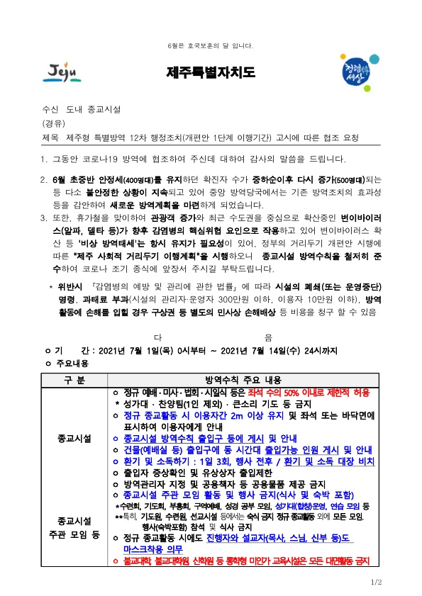 제주형 코로나 제12차 행정조치 (첨부문서도 참고)