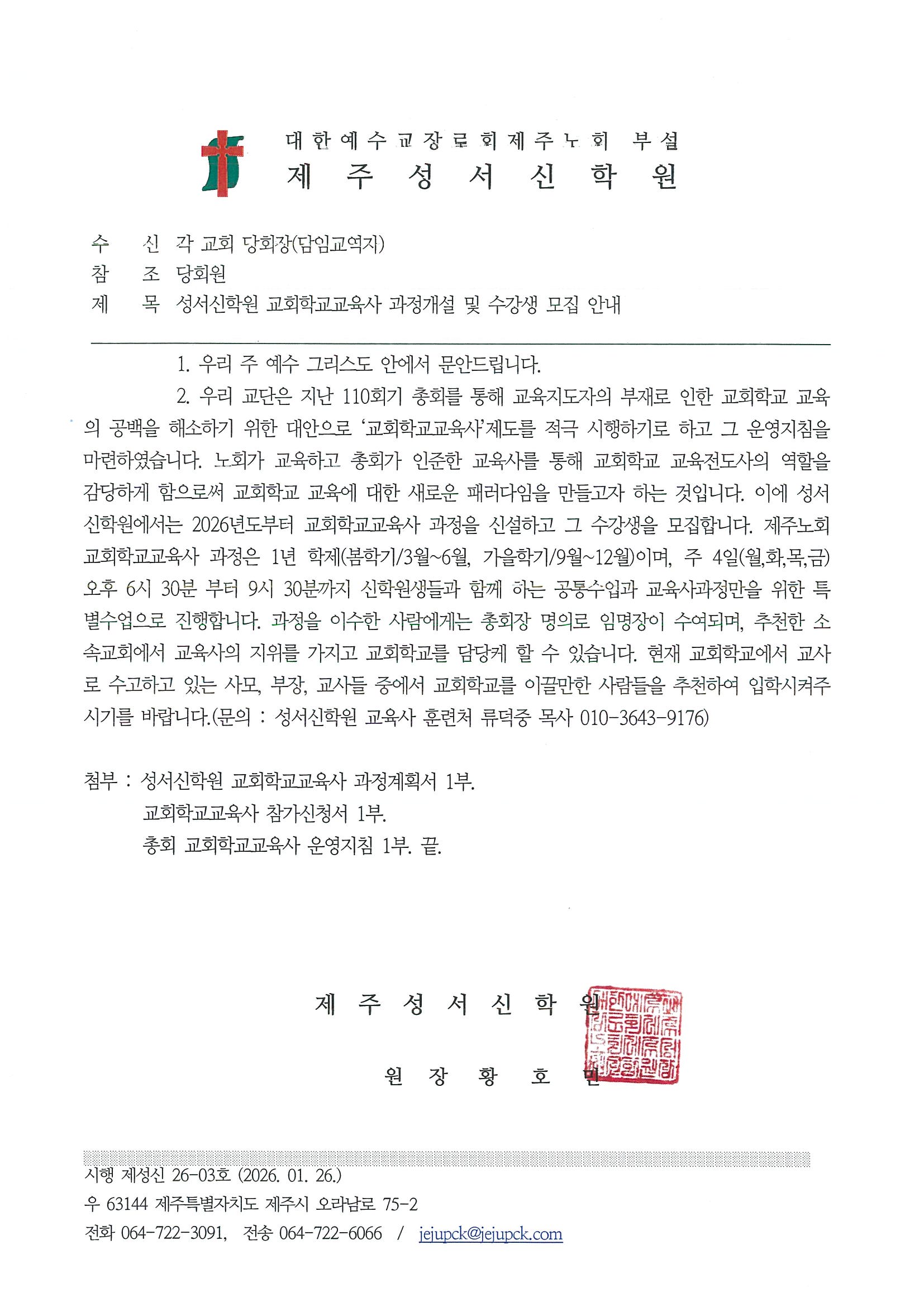 제주노회 발송 공문
